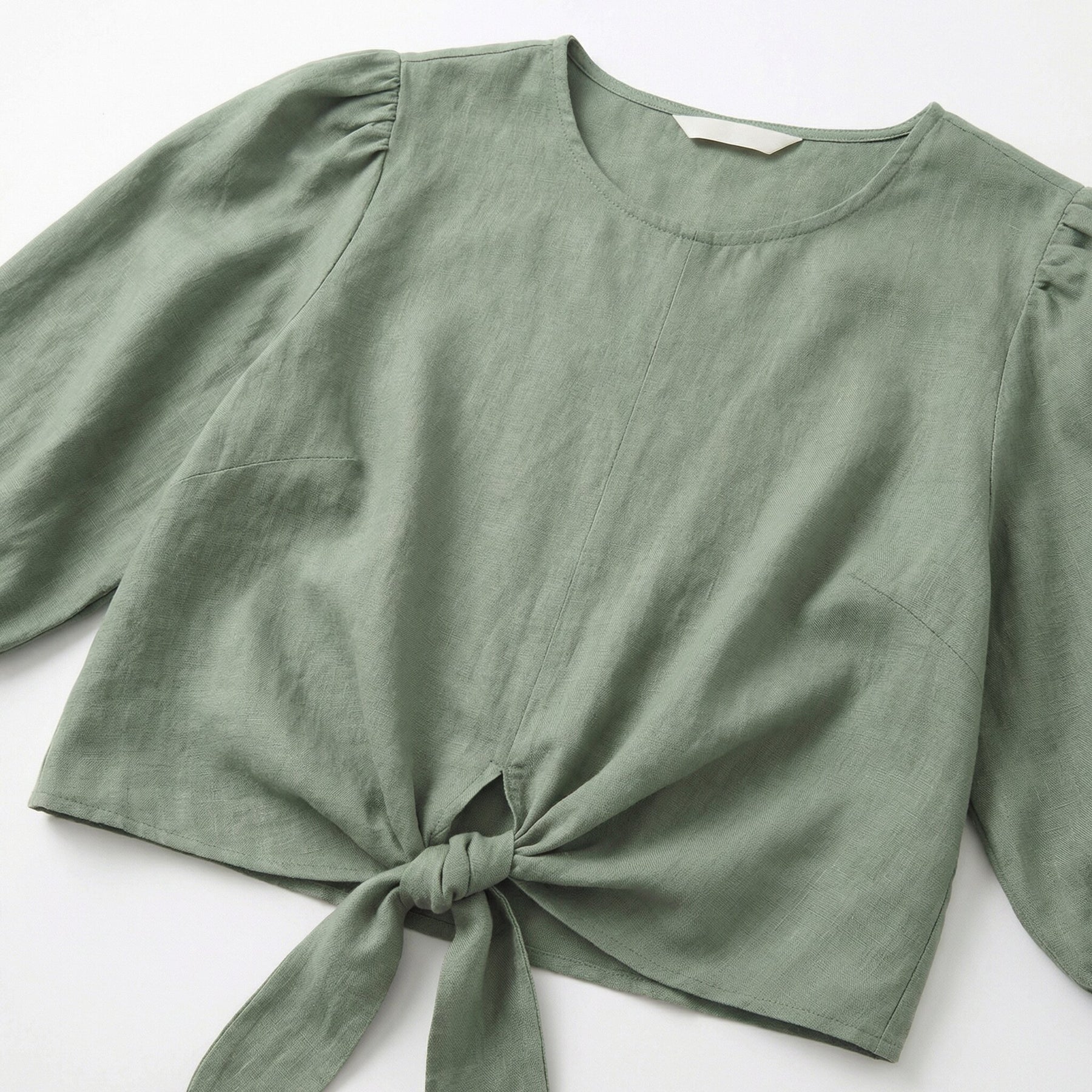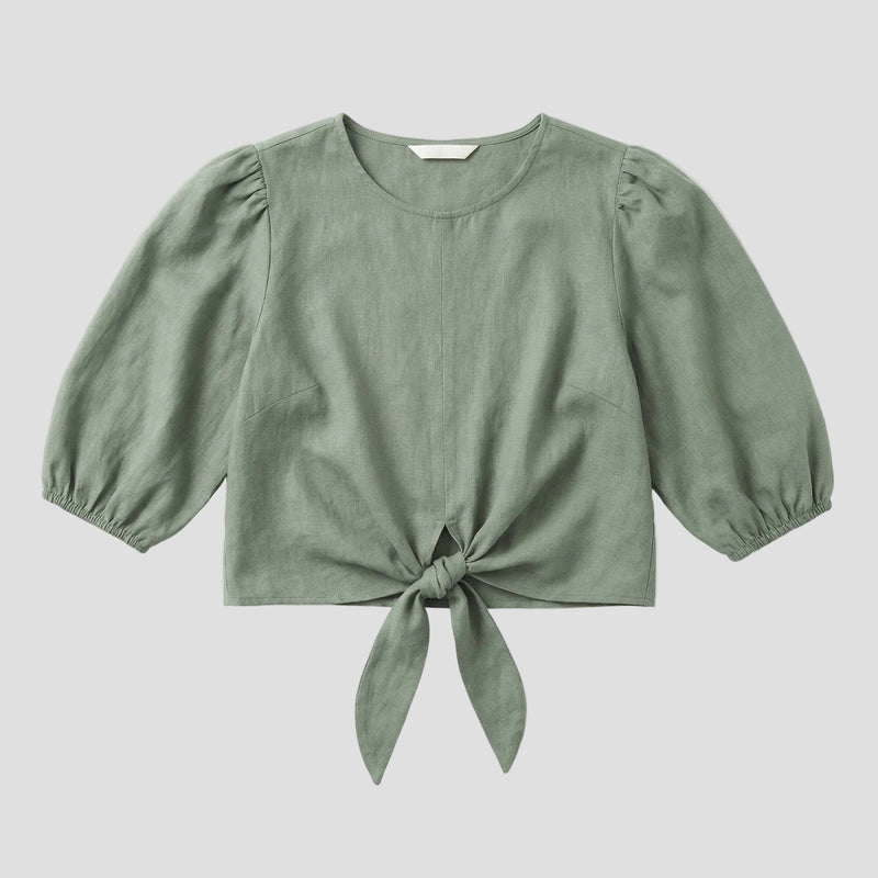 Denne grønne bluse med knude foran giver et moderne og friskt udtryk. De bløde ærmer tilføjer en flot volumen. Materialet er behageligt og velegnet til daglig brug. Blusen passer godt til både bukser og nederdele. Et perfekt valg til en afslappet, men stilfuld hverdag.
